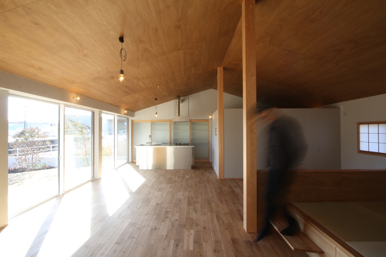LDKと就寝スペース、個室、畳コーナーを閉鎖せず、プライバシーを確保しながらも連続性を持たせ、ひとつ屋根の下で暮らす感覚を大切にした畳や障子など日本建築の要素を取り入れたシンプルモダンな平屋です。勾配梁と棟持柱で勾配天井の解放感と連続性のある空間となっています。子供スペースは成長と共に仕切り方を変えていく予定です。