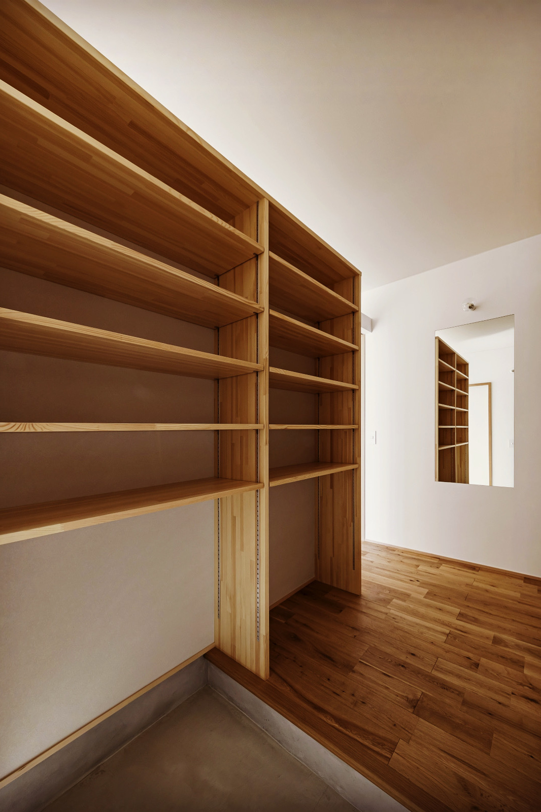 向かって左側は奥行300mm、右側は400mmとしています。高さは可動式で自由に調節できますので暮らしの変化に対応できます。写真には写っていませんがハンガーパイプも設置しています。