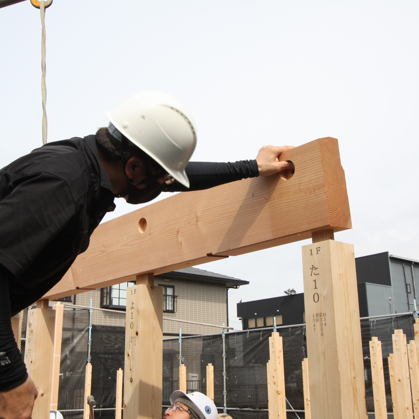 レッカーで桁を降ろしてきまして、ほぞを穴にあてがうようにガイドします。