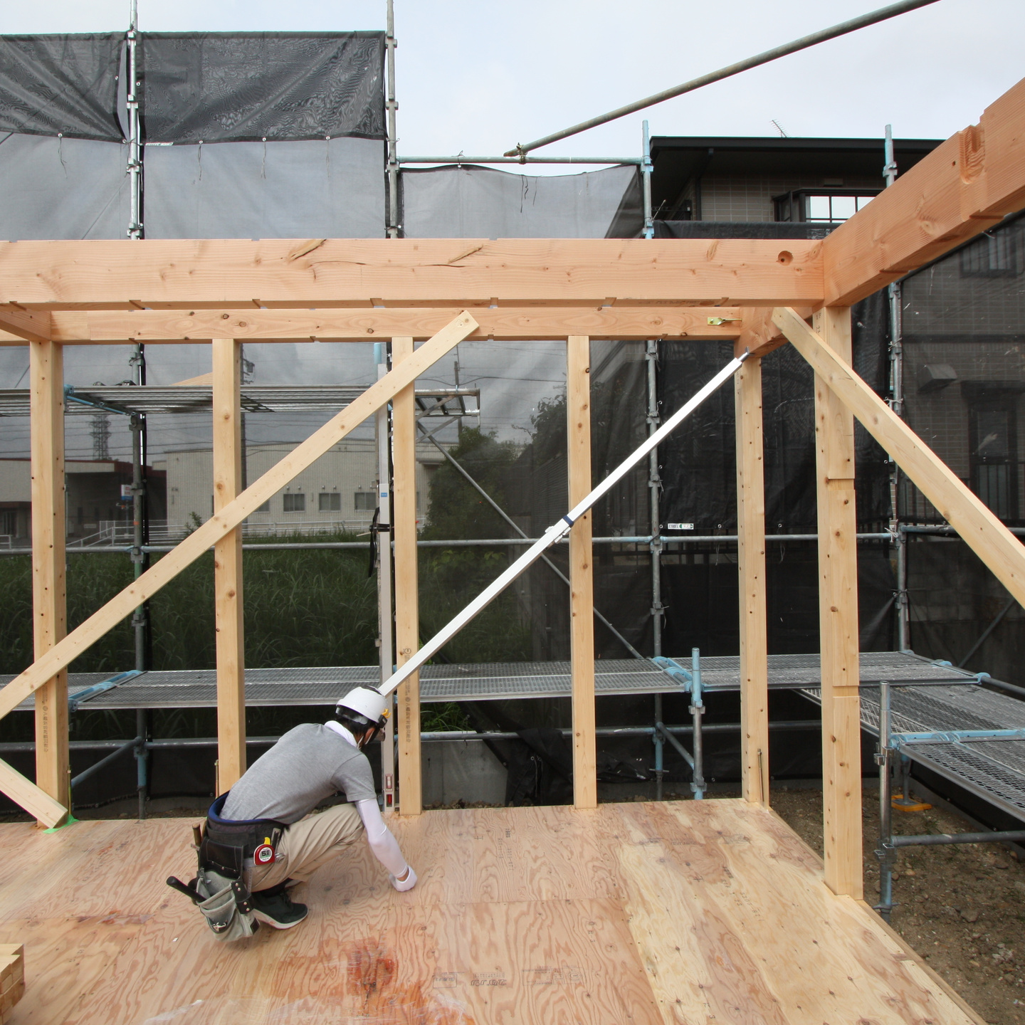 あわただしい現場の中、棟梁が建て起こしをチェックしています。