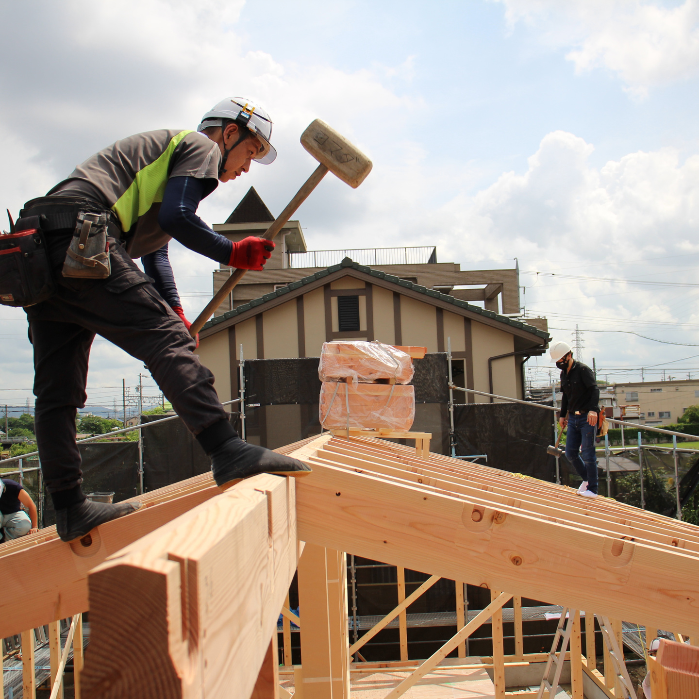 建て方の時は大工仲間が協力して工事をしますが、次の日からは木工事担当大工は棟梁一人で最後まで各種専門業者と工事を進めていきます。(大工兼現場監督)
