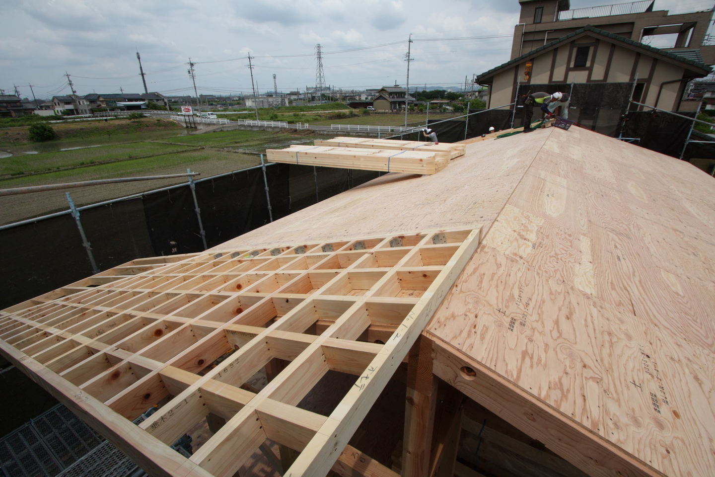 建て方翌日の屋根板金工事の測量の様子。