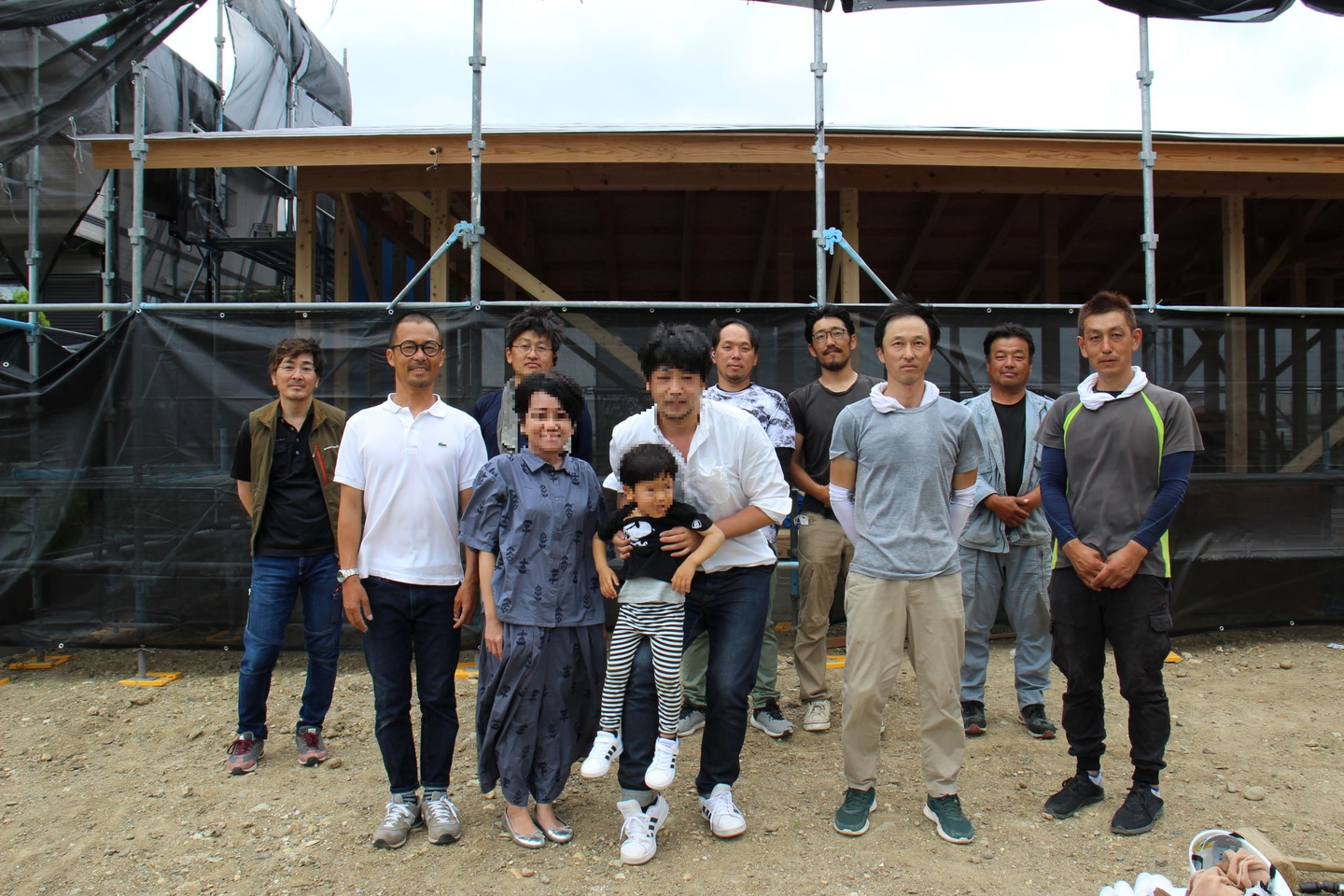 集まってくれた大工さん、レッカーオペさん、お施主様(個人情報保護のため画像処理させていただきました)と記念撮影のワンショット。
