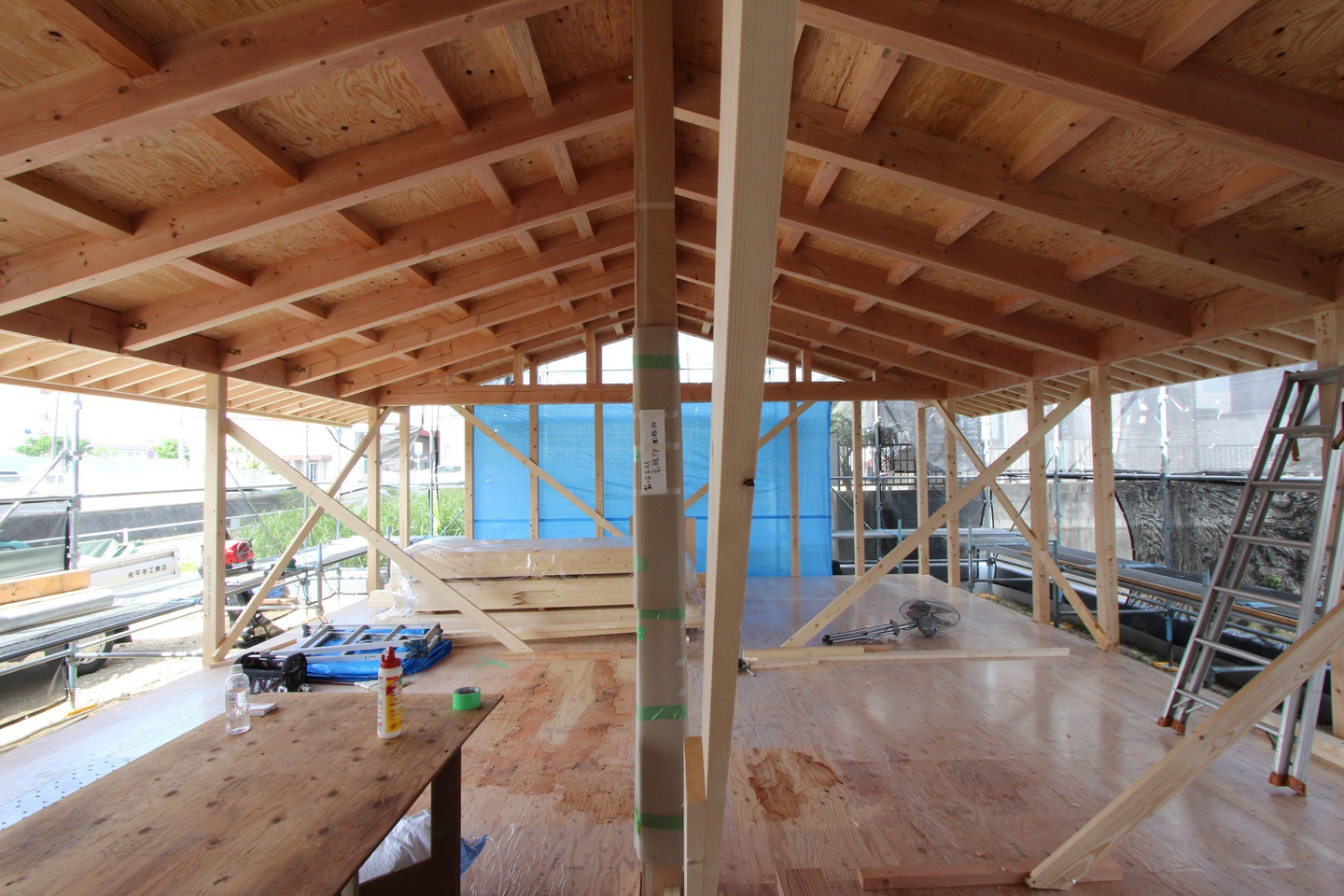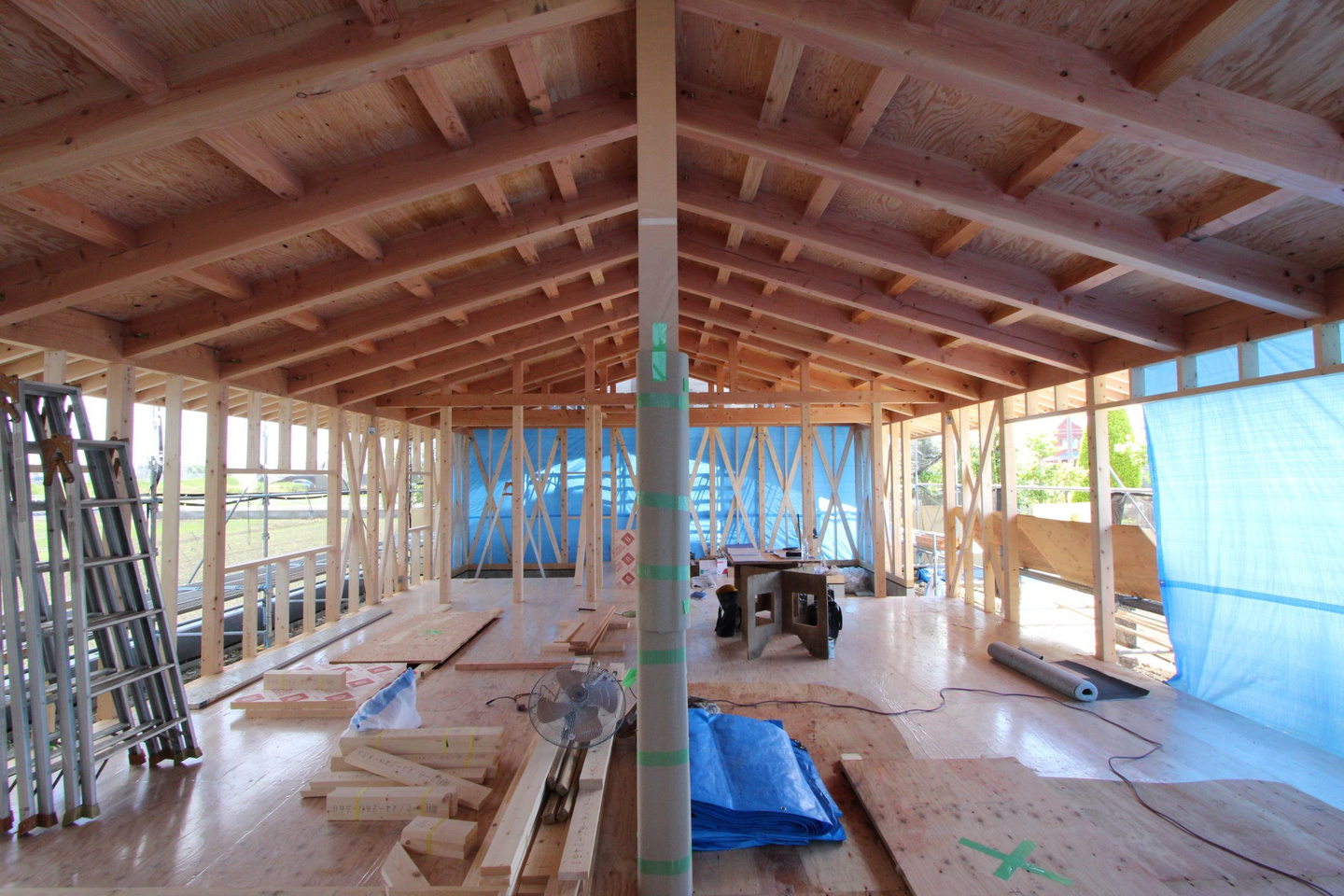 建て方翌日の内部からの様子。