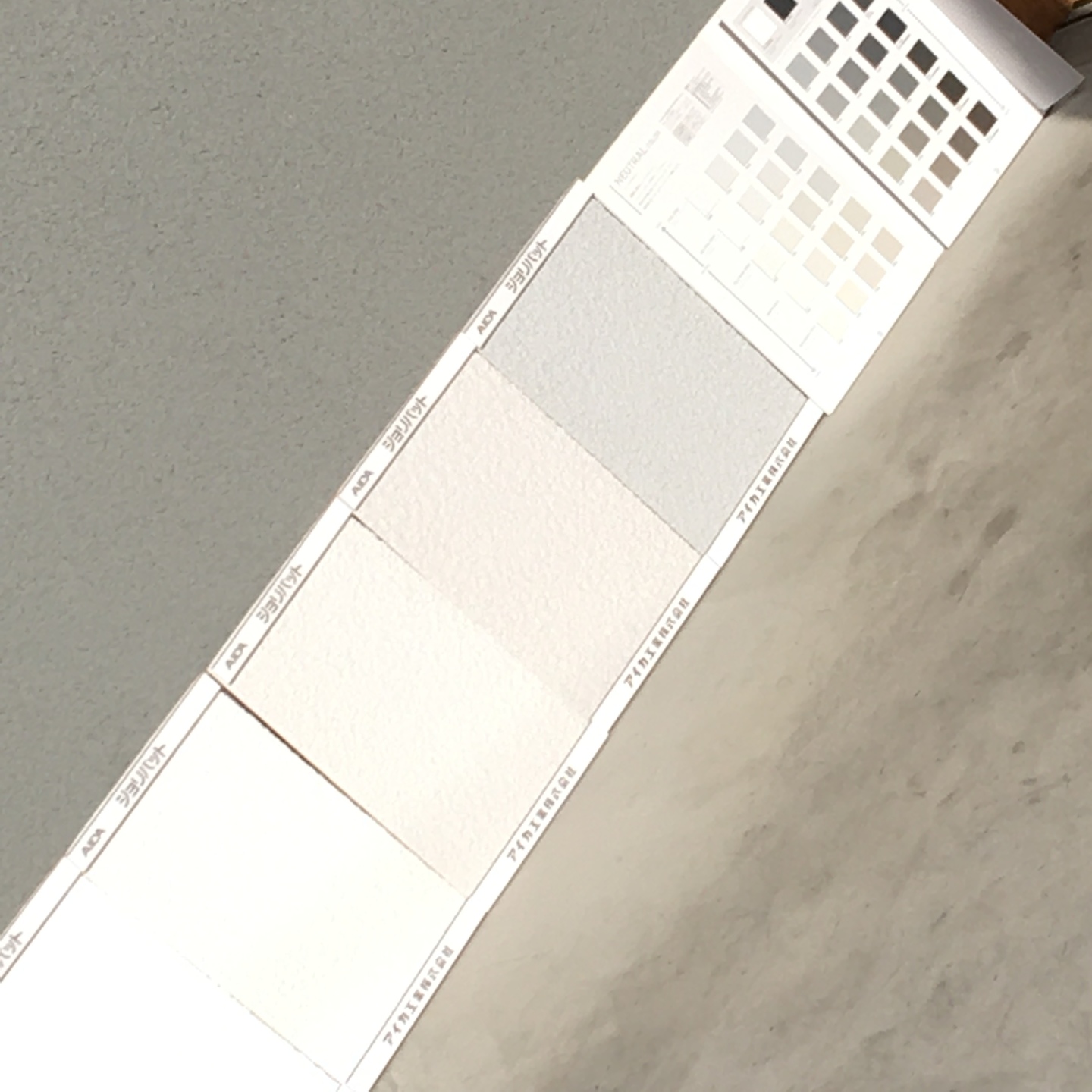 写真はアイカのジョリパット、ニュートラルグレーをいくつか並べています。ニュートラルというので無彩色かなと思っていましたが、実際サンプルを見ると赤、青、黄などの色味がありました。