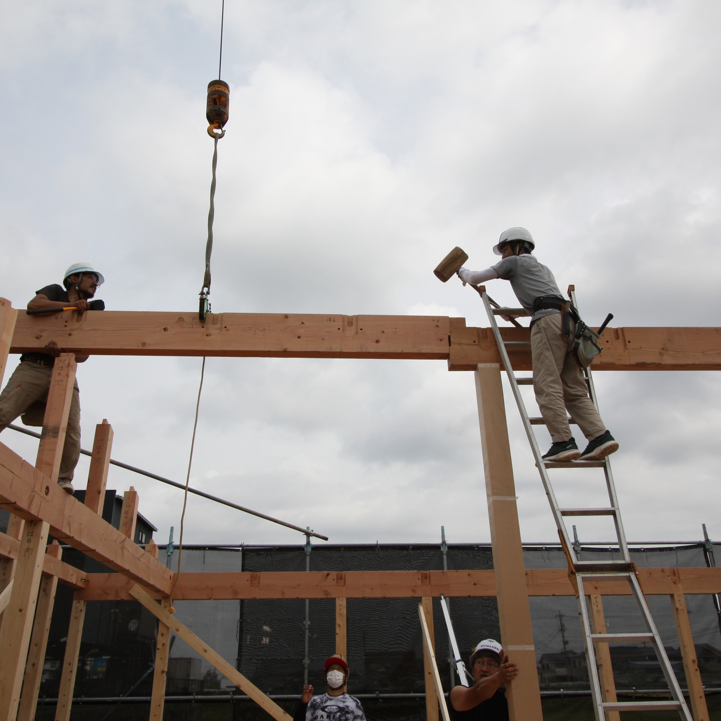 レッカーで桁を降ろしてきまして、ほぞを穴にあてがうようにガイドします。