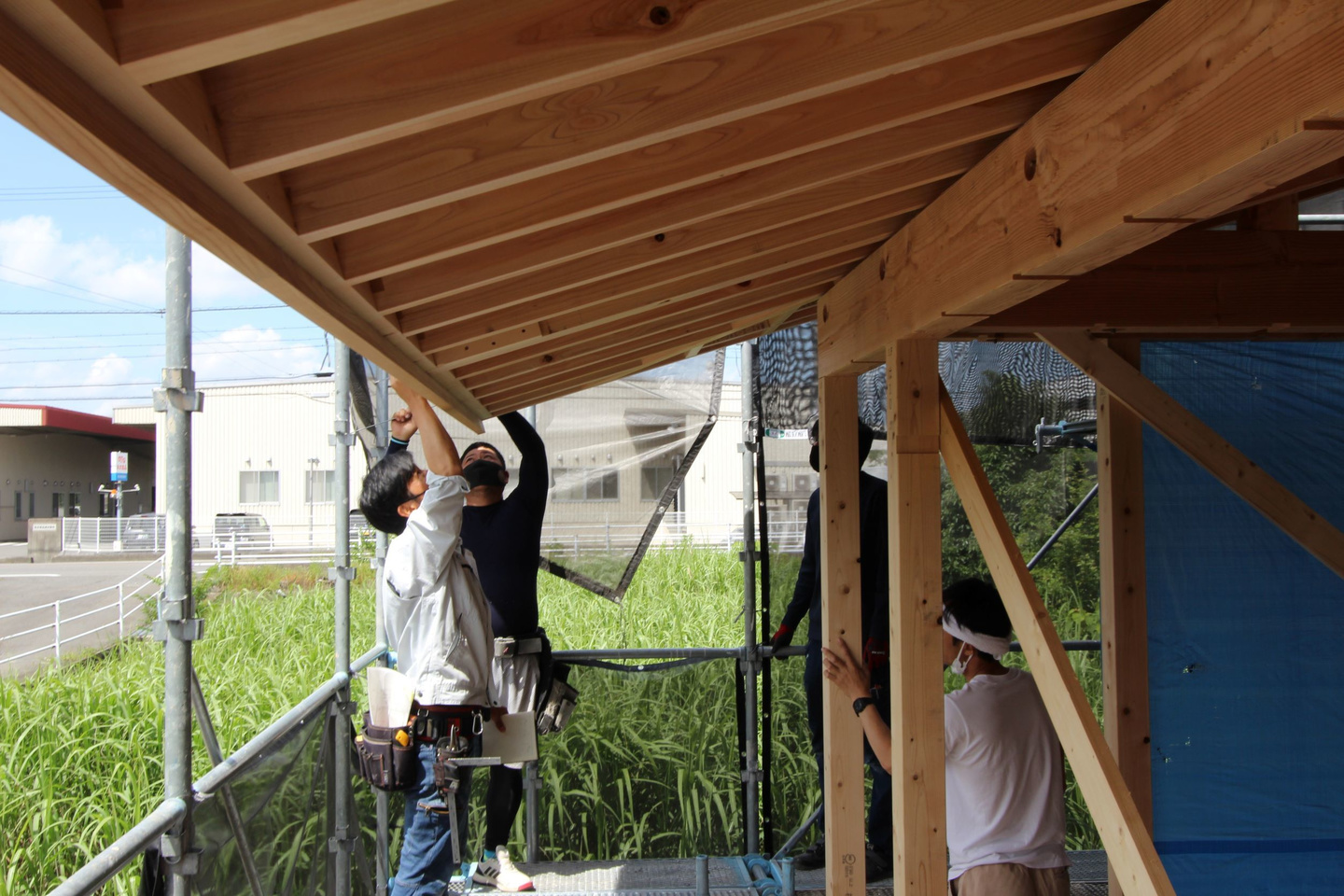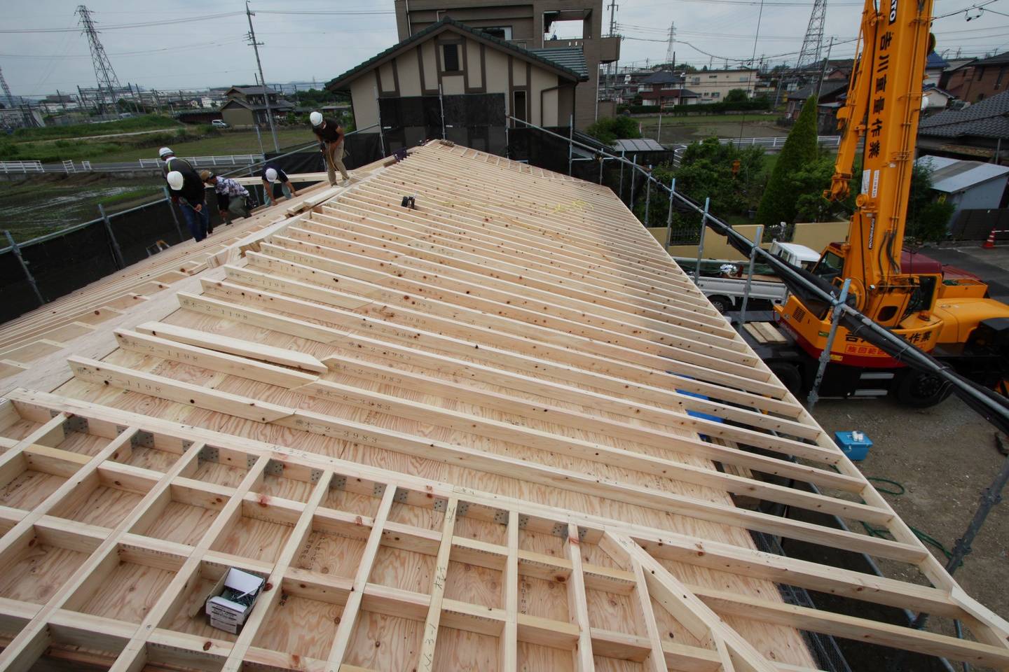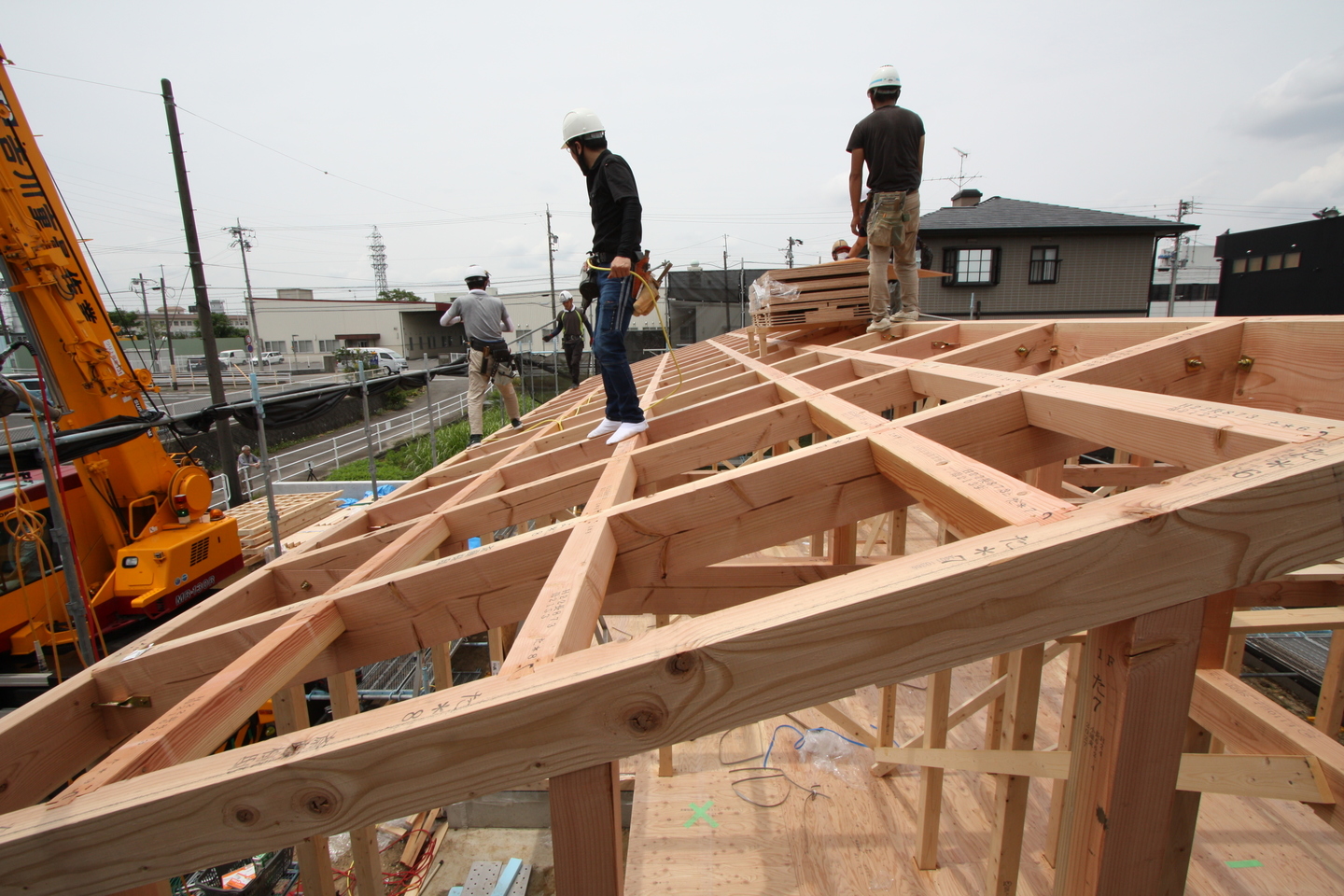 柱から横架材(梁、桁)、屋根仕舞いまでを組み上げていきます。